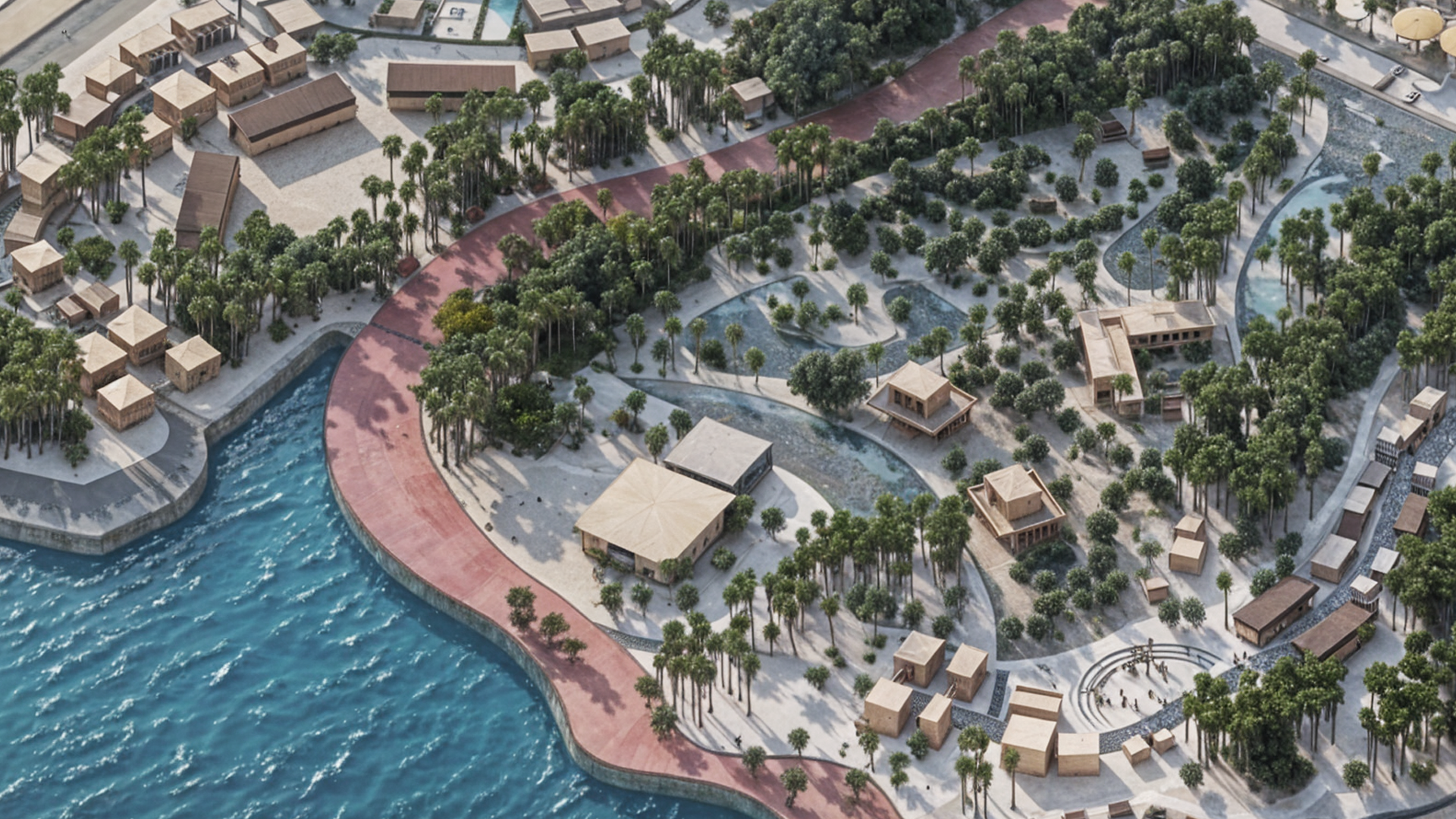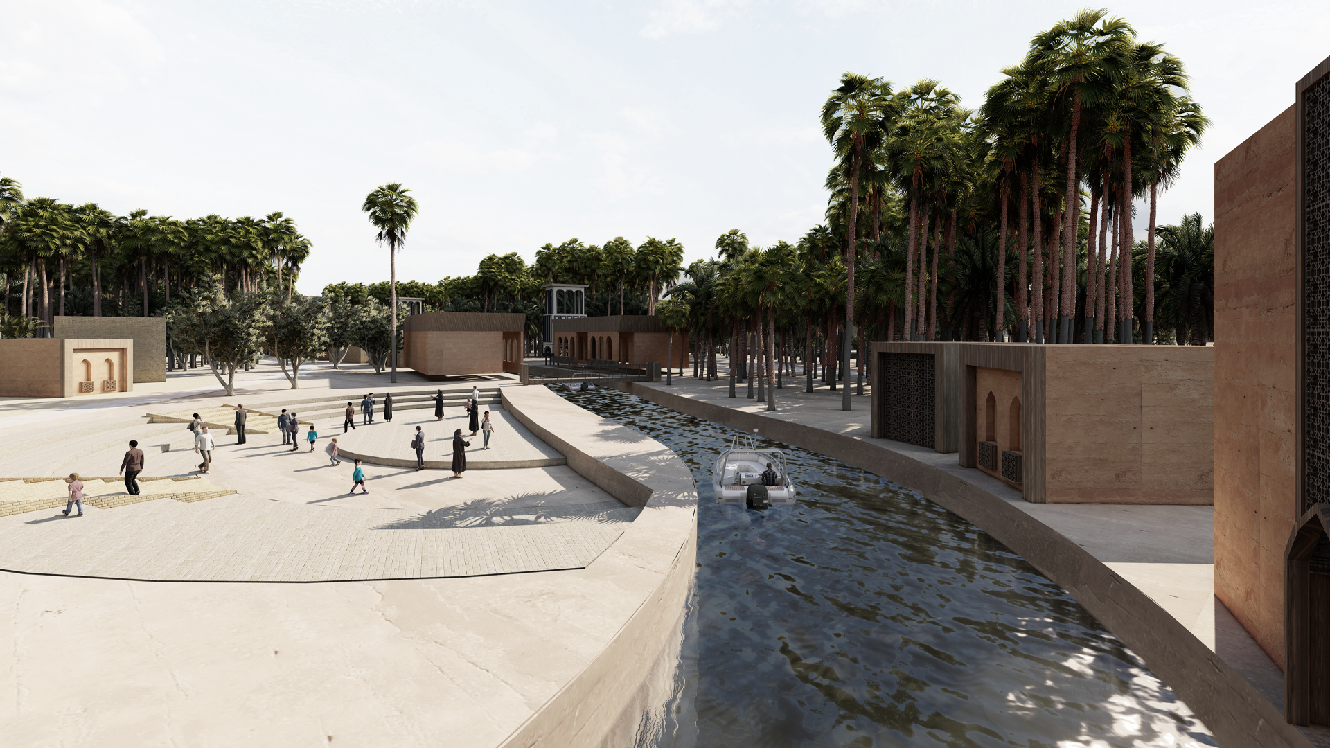 The island’s natural beauty, particularly its mature trees, is preserved and integrated into the urban fabric, while additional greenery enhances microclimate performance and comfort within Basra’s arid conditions.