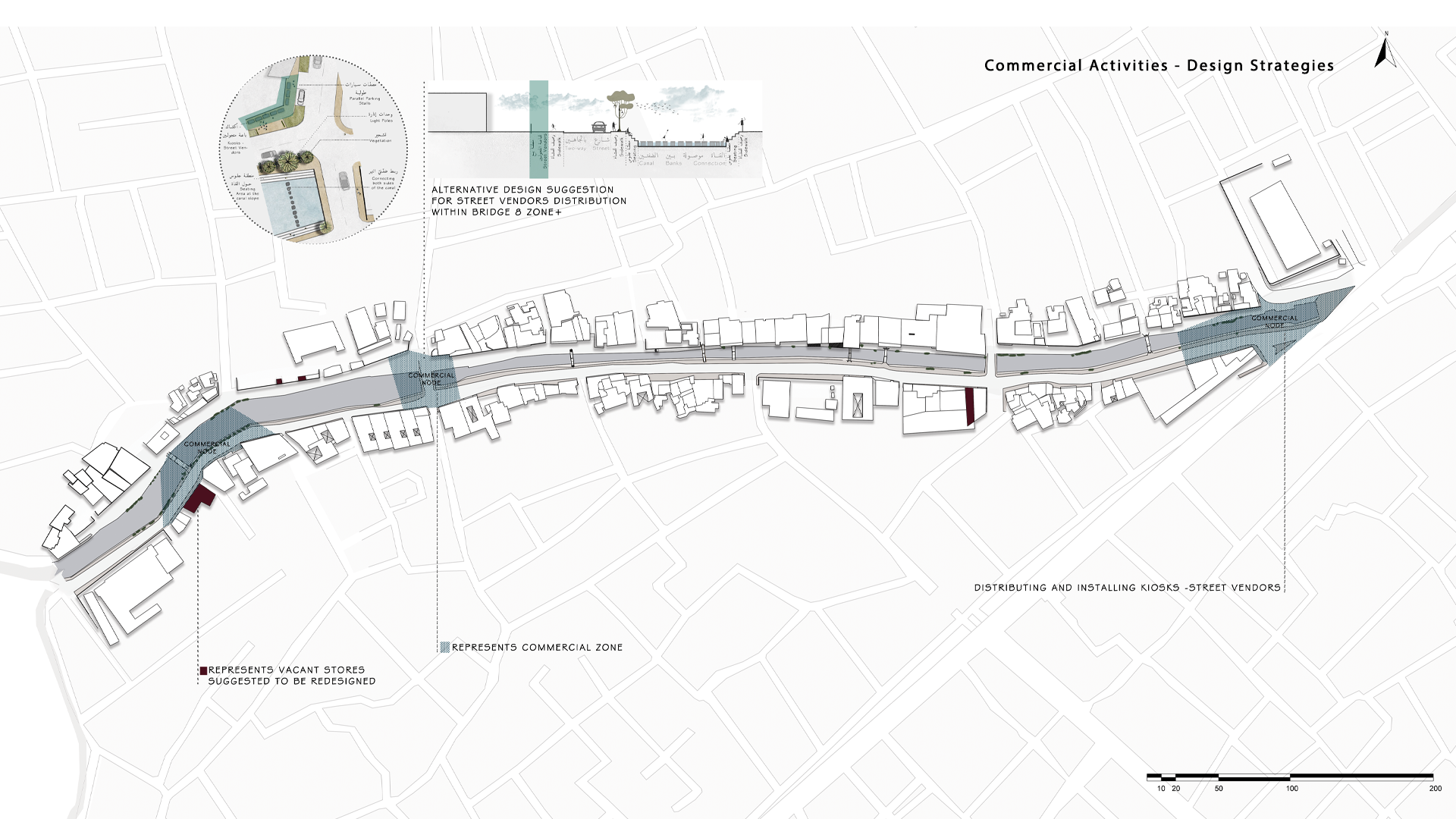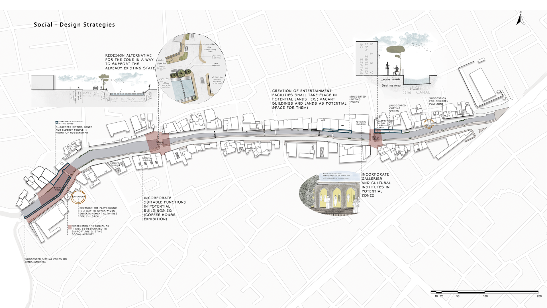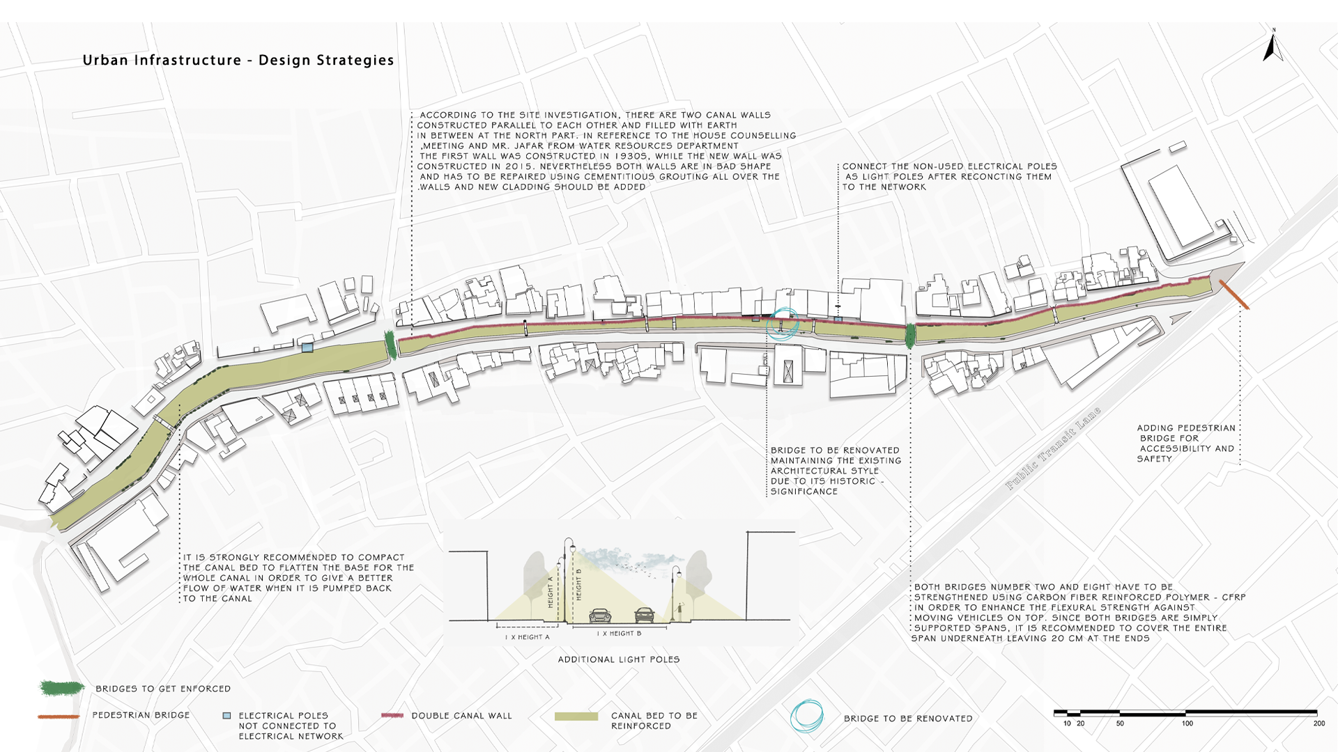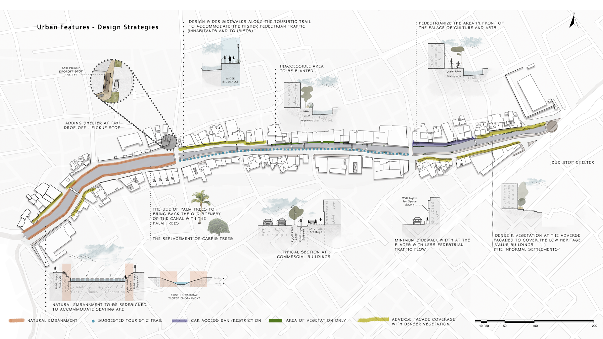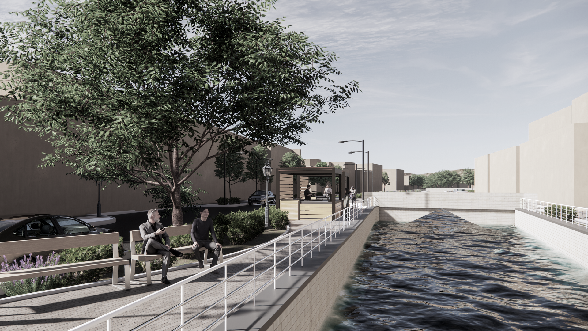 Through extensive documentation, structural and environmental assessments, and participatory workshops with local stakeholders, the project shapes a vision that is both contextually grounded and future-oriented. Shaded promenades, pedestrian bridges, and landscaped terraces redefine the canal’s edge as a space for social interaction and cultural continuity.